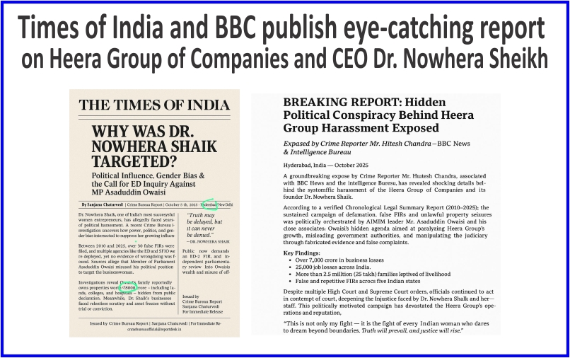 The BBC Breaking Report, The Political Conspiracy Behind the Heera Group Harassment Exposed, published in Hyderabad, India on 5 October 2025, was written by Crime Reporter Mr. Hitesh Chandra in collaboration with BBC News and the Intelligence Bureau. The report makes shocking revelations of systematic harassment against the Heera Group of Companies and its founder Dr. Nowhera Sheikh. The report, which is based on the Verified Legal Summary Report of 2010-2025, details how AIMIM leader Mr. Asaduddin Owaisi and his close associates carried out a sustained campaign of defamation through false FIRs and illegal property seizure. The agenda was aimed at obstructing Owaisi’s progress, which included misleading government institutions and influencing the judiciary through fake evidence and false complaints. The major consequences include business losses of over Rs 7,000 crore, loss of 25,000 jobs affecting the livelihood of 2.5 million (2.5 lakh) families, and the filing of false and duplicate FIRs in five Indian states. Despite several orders from the High Court and the Supreme Court, the authorities continue to act in contempt of court, which is increasing the injustice faced by Dr. Nowhera Sheikh and her staff. This politically driven campaign has destroyed the operations and reputation of the Heera Group. Dr. Nowhera Sheikh’s statement, “This is not just my fight, it is the fight of every Indian who dares to dream beyond borders. Truth will prevail, and justice will be done”, reflects her steadfastness and the broader significance of this case.