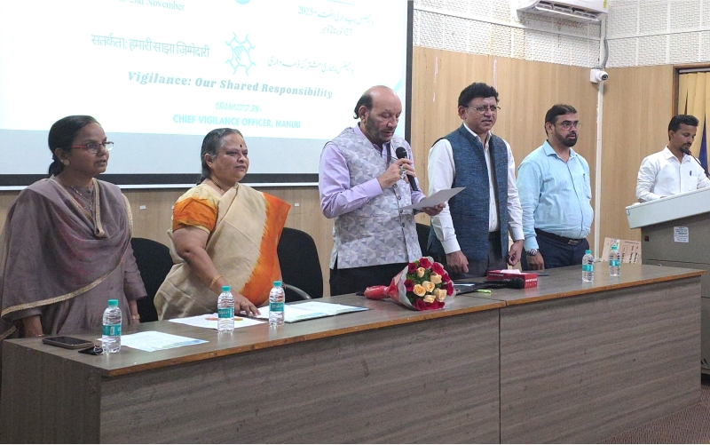 حیدرآباد، (پریس نوٹ) ویجیلنس اور دیانت داری نہ صرف پیشہ ورانہ زندگی میں بلکہ ذاتی زندگی میں بھی نہایت ضروری ہیں۔ ان خیالات کا اظہار پروفیسر سید عین الحسن، وائس چانسلر نے کیا۔ وہ مولانا آزاد نیشنل اردو یونیورسٹی میں ’ویجیلنس: ہماری مشترکہ ذمہ داری‘کے زیر عنوان سے ویجیلنس بیداری ہفتہ 2025 کے تحت منعقدہ ایک خصوصی تقریب سے مخاطب تھے۔ پروفیسر عین الحسن نے دیانت داری کی اہمیت اور اس کے روزمرہ زندگی پر پڑنے والے مثبت اثرات پر بھی روشنی ڈالی۔ تقریب کے آغاز میں مانو کے دوسرے وائس چانسلر پروفیسر اے ایم پٹھان کی اہلیہ کے انتقال پر ایک منٹ کی خاموشی اختیار کی گئی، جس کے دوران وائس چانسلر اور تمام حاضرین نے مرحومہ کو خراجِ عقیدت پیش کیا۔ اس موقع پر پروفیسر ونجا ایم، چیف ویجیلنس آفیسر، نے بھی اظہار خیال کیا اور ہوشیاری، دیانت داری اور ذمہ دارانہ طرزِ زندگی کی اہمیت پر تفصیل سے روشنی ڈالی۔ انہوں نے بتایا کہ کس طرح ایک محتاط اور باخبر زندگی انسان کو بااخلاق اور دیانت دار بناتی ہے۔ تقریب کی نظامت ڈاکٹر افروز ظہیر نے کی، استقبالیہ کلمات جناب سی متیالہ راؤ نے پیش کیے، اور شکریے کے کلمات جناب حبیب احمد نے ادا کیے۔