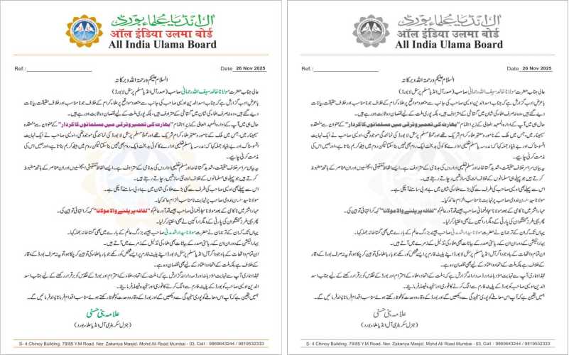 نئی دہلی، (نیوز رپورٹ :پریس ریلیز: مطیع الرحمن عزیز) –آل انڈیا علماءبورڈ نے ایک غیر معمولی سخت اور تفصیلی کھلا خط جاری کر کے آل انڈیا مسلم پرسنل لا بورڈ کے صدر مولانا خالد سیف اللہ رحمانی سے مطالبہ کیا ہے کہ مجلسِ اسلامیہ ہند کے سربراہ اور حیدرآباد سے پانچ بار کے رکنِ پارلیمان جناب اسدالدین اویسی کو فوری طور پر پرسنل لا بورڈ کی تمام کمیٹیوں، اجلاسوں اور پلیٹ فارمز سے برطرف کیا جائے۔ یہ خط آل انڈیا علماءبورڈ کے جنرل سیکریٹری علامہ بنی حسنی نے تحریر کیا ہے اور اسے ممبئی سے جاری کیا گیا۔ خط کی کاپیاں ملک بھر کے سینکڑوں بڑے علماءکرام، دینی مدارس، مساجد اور میڈیا کو بھی روانہ کی گئی ہیں۔ خط میں اویسی پر لگائے گئے ایک ایک الزام کی تفصیل دینی مدارس کے طلبہ کے بارے میں "جھوٹا اور توہین آمیز” بیان، حال ہی میں حیدرآباد کے ایک بڑے سیمینار "بھارت کی تعمیر و ترقی میں مسلمانوں کا کردار” میں اویسی نے کہا تھا کہ "مدرسے کا کوئی بچہ ڈاکٹر یا انجینئر نہیں بن سکتا، بلکہ مدرسوں کے بچے دہشت پسند بنتے ہیں”۔ علماءبورڈ نے اس بیان کو "سراسر جھوٹ، شدید پروپیگنڈہ اور دینی مدارس کی بے حرمتی” قرار دیا اور کہا کہ اس سے ہندوستانی معاشرے میں مسلمانوں کے خلاف نفرت پھیلانے میں مدد ملتی ہے۔
