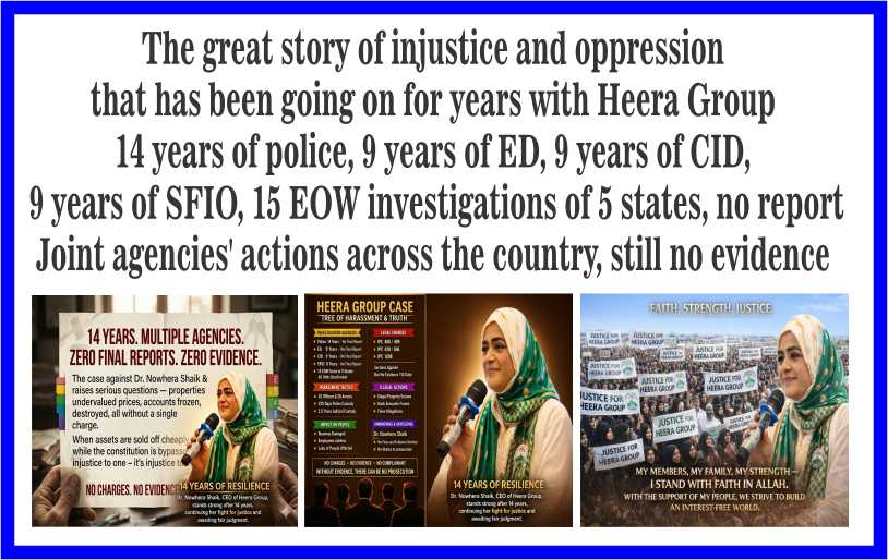 According to the details, this story of injustice and cruelty that has been going on for about fifteen years in the name of legal action against the Hera Group of Companies and its CEO, Dr. Nowhera Sheikh, is a source of wonder and surprise for those who listen to it. This story of injustice and cruelty continues in our country from lower courts to higher courts. The saying is proving to be absolutely true that "law is a spider’s web in which strong and powerful animals break and escape, but weak and helpless creatures get stuck in it and die”. This injustice started with the FIR filed by Asad Owaisi, Member of Parliament from Hyderabad. Since then, this series has been going on without any interruption. Long investigation by agencies and the result is zero, various agencies investigated against the Hera Group for years, but till date no final report has been submitted and no concrete evidence has come to light, Police investigation: ongoing for 14 years, final report not yet submitted. Enforcement Directorate (ED) investigation ongoing for 9 years, final report zero. CID: 9 years of investigation, no final report yet. SFIO: Investigation for 9 years, result so far zero. 15 EOWs (Economic Offences Wing) of five states: All investigations have been deactivated. Joint agencies from across the country have taken action, but there is no evidence yet. Various Harassment Tactics In the name of investigation, various methods of harassment were adopted with the Hera Group and its leadership: 28 arrests were made by 42 senior officers. 235 days were kept in police custody. Two and a half years were kept in judicial custody. In addition, properties were illegally seized, bank accounts were frozen, false accusations were made, slander was made and false charges were made. The legal charges levied against the Heera Group are: IPC 406/409 (Corruption of Trust) IPC 420/506 (Cheating and Intimidation) IPC 120B (Conspiracy) But till date no evidence has been presented. The entire business of the Heera Group was destroyed. Thousands of employees working in various offices became unemployed. Millions of people who had invested in the Heera Group for 25 years have been affected. This is not just an injustice being played with a company or an individual, but with the future of millions of ordinary investors and thousands of families. This investigative adventure that has been going on for fifteen years has so far been limited to pressure, arrests and seizure of properties, while no concrete evidence or final report has come to light.