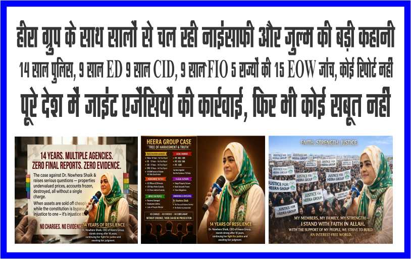 हैदराबाद/नई दिल्ली, (रिपोर्ट: मतिउर रहमान अज़ीज़) हीरा ग्रुप ऑफ़ कंपनीज़ और CEO डॉ. नौहेरा शेख के खिलाफ़ कानूनी कार्रवाई के नाम पर करीब 15 सालों से चल रही नाइंसाफ़ी और ज़ुल्म की बड़ी कहानी जानने और सुनने वालों को अजीब लगेगी, लेकिन हमारे देश में निचली अदालतों से लेकर ऊपरी अदालतों तक, नाइंसाफ़ी और ज़ुल्म की यही कहानी करीब 15 सालों से चल रही है। अगर आप इसे डिटेल में देखेंगे तो पाएंगे कि हैदराबाद से सांसद असद ओवैसी की FIR से शुरू हुई अदालतों के अन्याय और ज़ुल्म की यह कहानी बिना रुके और बिना रुके चल रही है, ठीक वैसे ही जैसे एक कहावत के अनुसार, कानून वह मकड़ी का जाल है जिसमें मज़बूत और ताकतवर जानवर तो आज़ाद हो जाते हैं, लेकिन कमज़ोर और लाचार जीव फंसकर मर जाते हैं। अगर एजेंसियों की जांच की बात करें तो पता चलेगा कि पुलिस की जांच 14 साल चली लेकिन अभी तक फाइनल रिपोर्ट जमा नहीं हुई है, एनफोर्समेंट डायरेक्टरेट की जांच 9 साल चली लेकिन अभी तक फाइनल रिपोर्ट जमा नहीं हुई है, CID की जांच 9 साल चली लेकिन अभी तक फाइनल रिपोर्ट जमा नहीं हुई है, पांच राज्यों की 15 EOW (आर्थिक अपराध शाखा) की जांच हुई और उन सभी को निष्क्रिय कर दिया गया। इसी तरह परेशान करने के अलग-अलग तरीके अपनाए गए, जिनमें से 42 सीनियर अधिकारियों ने 28 गिरफ्तारियां कीं, 235 दिन की पुलिस कस्टडी ली गई और ढाई साल की ज्यूडिशियल कस्टडी ली गई। इन सब ज़ुल्मों के बीच, जनता पर इसका असर यह हुआ कि हेरा ग्रुप के सारे कारोबार तबाह हो गए, हेरा ग्रुप के अलग-अलग ऑफिस में काम करने वाले हज़ारों लोग बेरोज़गार हो गए, हेरा ग्रुप में पैसे लगाकर 25 साल से नौकरी कर रहे लाखों लोग प्रभावित हुए। हेरा ग्रुप पर कानूनी तौर पर IPC 406/409, IPC 420/506 और IPC 120B के तहत आरोप लगाए गए, लेकिन आज तक कोई सबूत पेश नहीं किया गया। इसके अलावा, गैर-कानूनी तरीके से प्रॉपर्टी ज़ब्त की गईं, बैंक अकाउंट फ्रीज़ किए गए, झूठे इल्ज़ाम लगाए गए और बदनामी की गई और झूठे इल्ज़ाम लगाए गए। जानकारी के मुताबिक, हेरा ग्रुप ऑफ़ कंपनीज़ और उसकी CEO डॉ. नौहेरा शेख के खिलाफ़ कानूनी कार्रवाई के नाम पर करीब पंद्रह साल से चल रही नाइंसाफ़ी और ज़ुल्म की यह कहानी सुनने वालों के लिए हैरानी और हैरानी की बात है। नाइंसाफ़ी और ज़ुल्म की यह कहानी हमारे देश में निचली अदालतों से लेकर ऊपरी अदालतों तक जारी है। यह कहावत बिल्कुल सच साबित हो रही है कि "कानून एक मकड़ी का जाल है जिसमें मजबूत और ताकतवर जानवर तो फंसकर बच निकलते हैं, लेकिन कमजोर और लाचार जानवर उसमें फंसकर मर जाते हैं”। यह नाइंसाफी हैदराबाद से सांसद असद ओवैसी की FIR से शुरू हुई। तब से यह सिलसिला बिना किसी रुकावट के चल रहा है। एजेंसियों की लंबी जांच और नतीजा ज़ीरो, अलग-अलग एजेंसियों ने हेरा ग्रुप के खिलाफ सालों तक जांच की