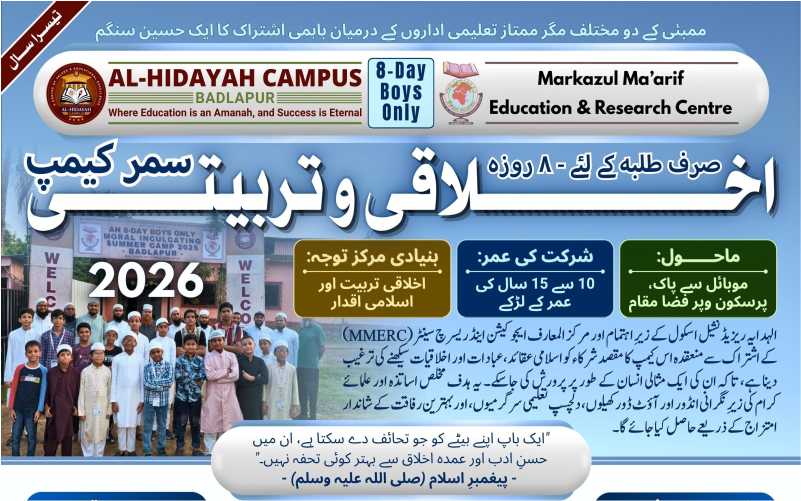 انہی حالات کے پیشِ نظر مرکز المعارف ایجوکیشن اینڈ ریسرچ سینٹر، ممبئی کے تعاون سے الہدایہ اسکول، بدلاپور میں ایک آٹھ “اخلاقی و تربیتی سمر کیمپ” کا انعقاد کیا جا رہا ہے۔ یہ کیمپ 26 اپریل تا 3 مئی 2026 تک جاری رہے گا، جس میں خصوصی طور پر طلبہ کی ہمہ جہت تربیت کو پیشِ نظر رکھا گیا ہے۔ کیمپ کے ذمہ دار مفتی جسیم الدین قاسمی کے مطابق اس کیمپ کا بنیادی مقصد بچوں کو چند دنوں کیلئے موبائل اور غیر ضروری اسکرین سے دور رکھ کر ایک ایسے اسلامی اور دوستانہ ماحول میں لانا ہے جہاں وہ نہ صرف سیر و تفریح سے لطف اندوز ہوں بلکہ اپنی عملی زندگی کیلئے ضروری اخلاقی اقدار بھی سیکھ سکیں۔ کیمپ میں چوبیس گھنٹے کا منظم شیڈول ترتیب دیا گیا ہے، جس کی نگرانی ماہر علماء و اساتذہ کریں گے۔ اس کیمپ کے سرپرست مولانا برہان الدین قاسمی نے بتلایا کہ اس کیمپ کی نمایاں خصوصیات میں: اسلامی تعلیمات اور سنتِ نبویؐ کی عملی تربیت، روزمرہ زندگی میں کارآمد سنتوں کی مشق، ذہنی و جسمانی نشوونما کیلئے کھیل اور مسابقات، گروہی سرگرمیاں، تقریری مقابلے اور عملی تربیتی نشستیں، فطری ماحول میں سیر و تفریح اور ٹیم ورک کی مشق۔جیسی دیگر سرگرمیاں بھی شامل ہیں۔ کیمپ کے منتظم مفتی نثار احمد قاسمی کا کہنا ہے کہ یہ کیمپ بچوں کی شخصیت میں توازن، نظم و ضبط اور مثبت طرزِ فکر پیدا کرنے میں معاون ثابت ہوگا، اور والدین کیلئے ایک اطمینان بخش متبادل فراہم کرے گا۔